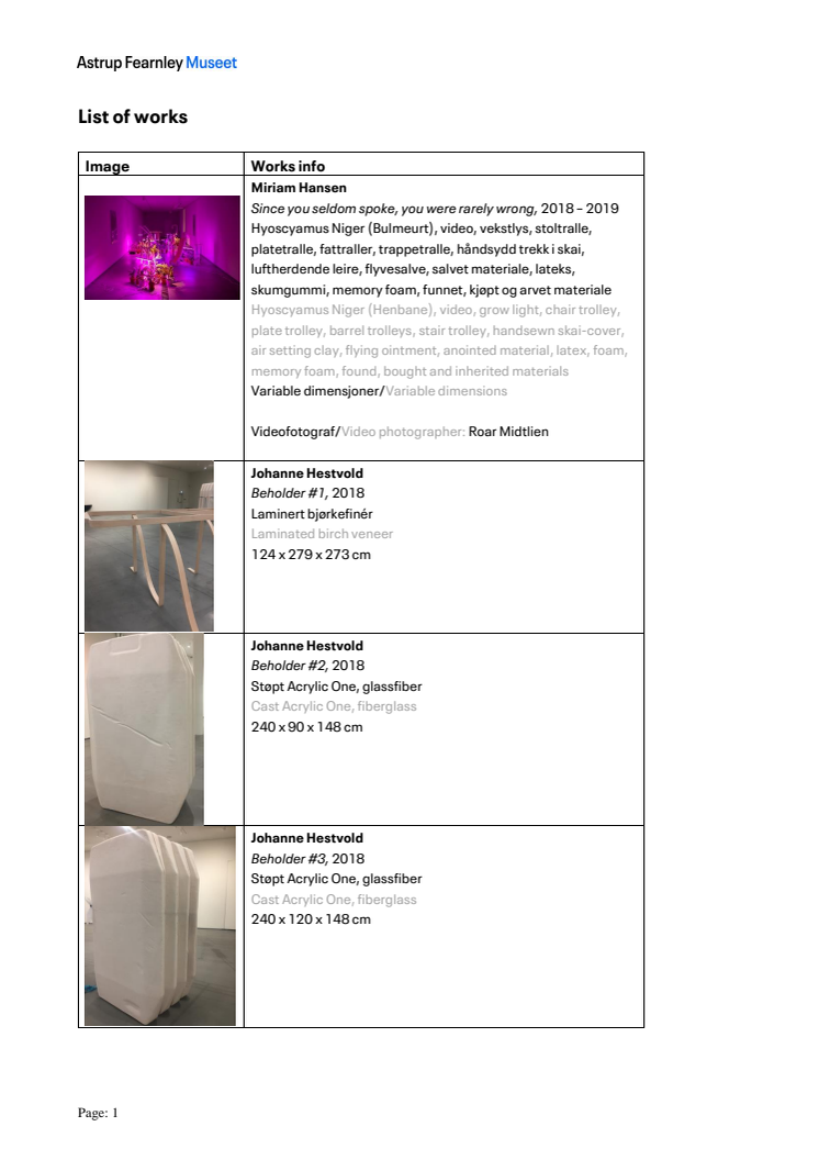 List of Works - Sun and Spring in January - Next Generation in Norwegian Contemporary Art